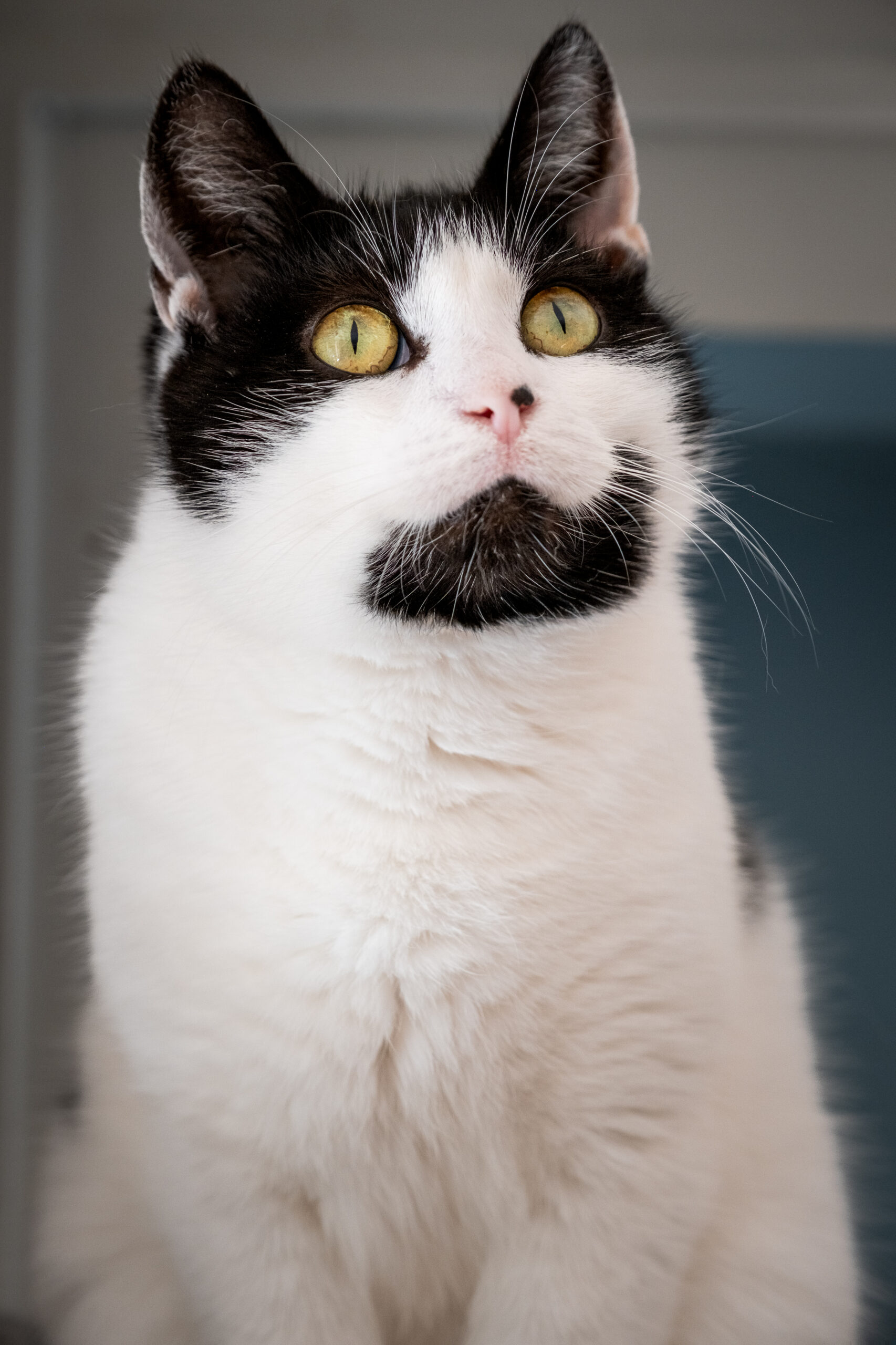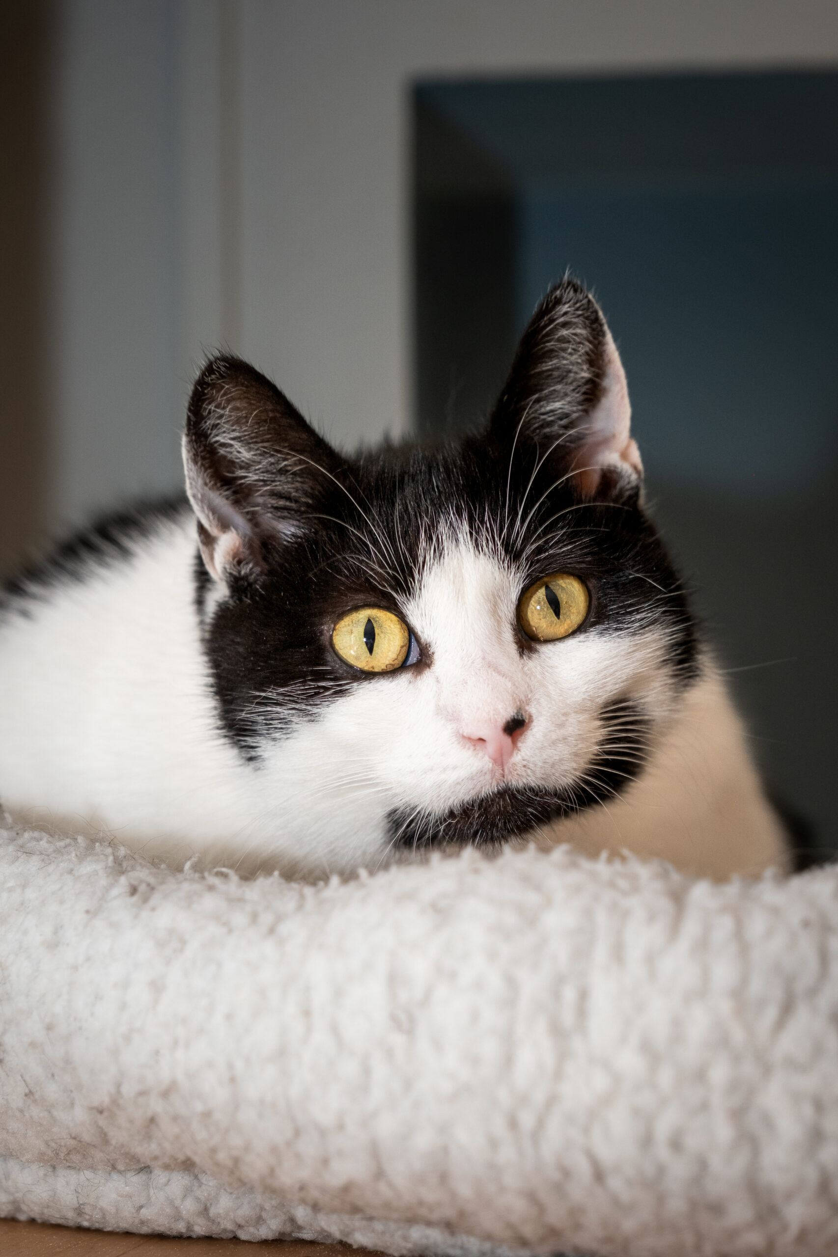 To bardzo drobenj budowy, młoda koteczka. Nie wchodzi w konflikty, bardzo dobrze żyje z innymi kotami, lubi się bawić i podjadać mięsne smakołyki.